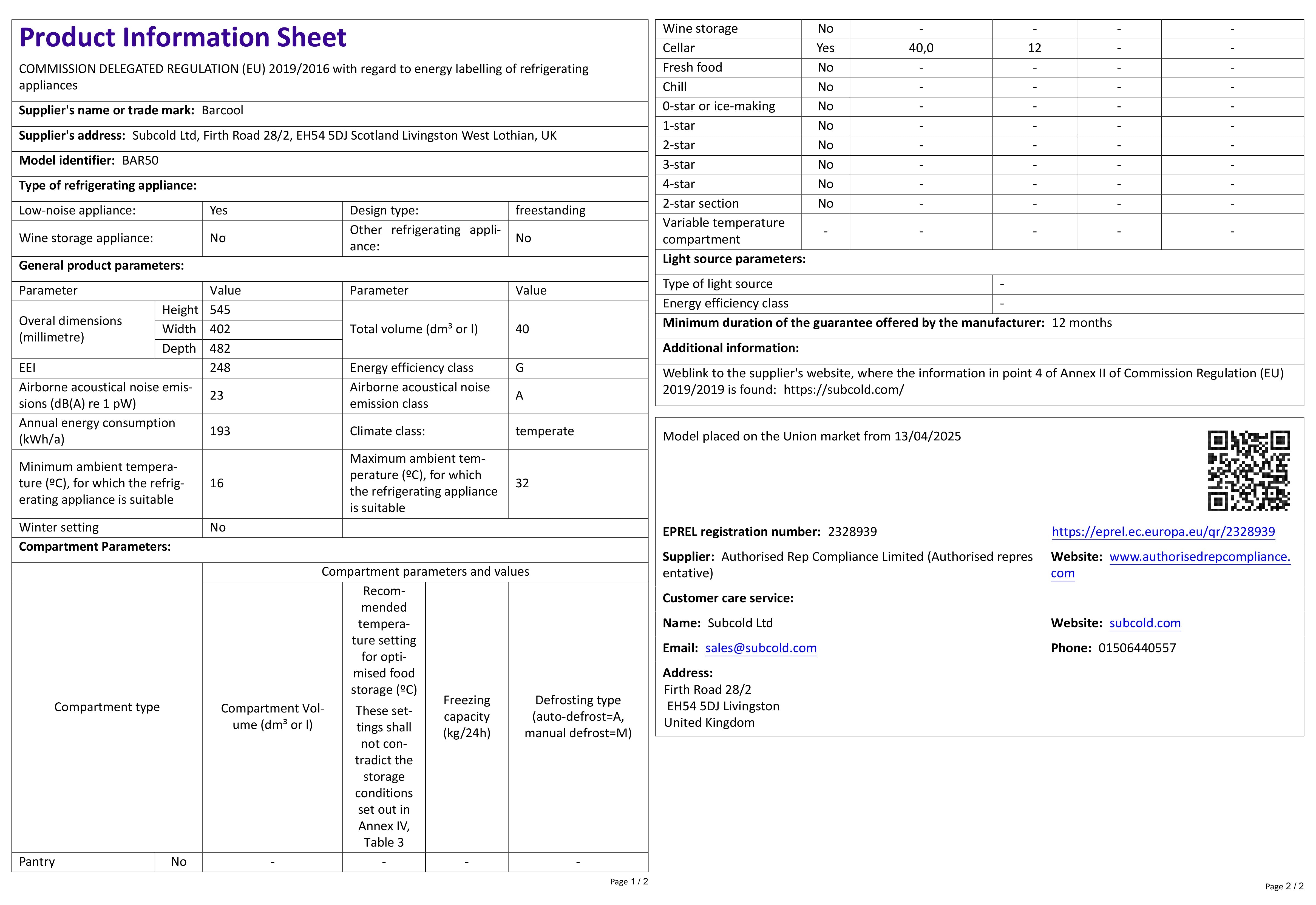 The design of the Barcool Bar50 LED is highly versatile and fits well into most quiet areas such as a bedroom, hotel room, guesthouse or a B&B. It is energy efficient fridge offering reliable cooling. Thanks to its high presentation factor and low noise operation [23dB] - this advanced mini bar fridge is suitable for use in any room!